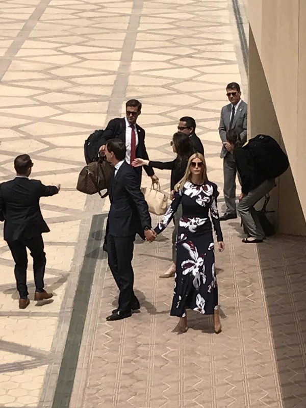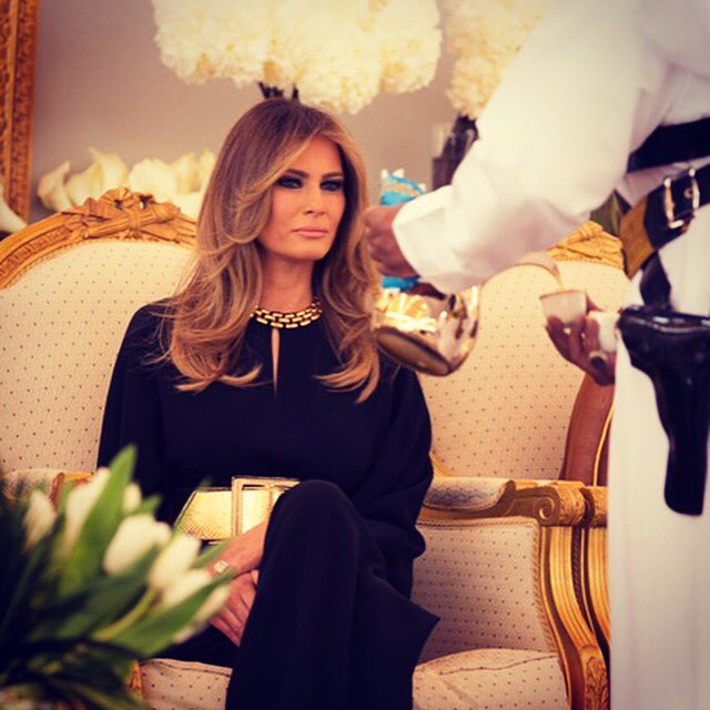 При этом первая леди Америки и ее дочь приехали на встречу в консервативной одежде, учитывая дресс-код в мусульманской стране. Меланья была одета в костюм-комбинезон с золотым широким поясом, который полностью закрывал руки и ноги. На Иванке было длинное черное платье с красно-белым цветочным рисунком и длинными рукавами.