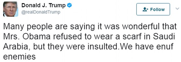 Дело в том, что в 2015 году Дональд Трамп в Twitter осудил Мишель Обаму за непокрытую голову во время визита с Бараком Обамой в Эр-Рияд. "Многие говорят, что это здорово, что миссис Обама отказалась надеть платок в Саудовской Аравии. Но они обиделись. А у нас и так достаточно врагов", - написал тогда Трамп.