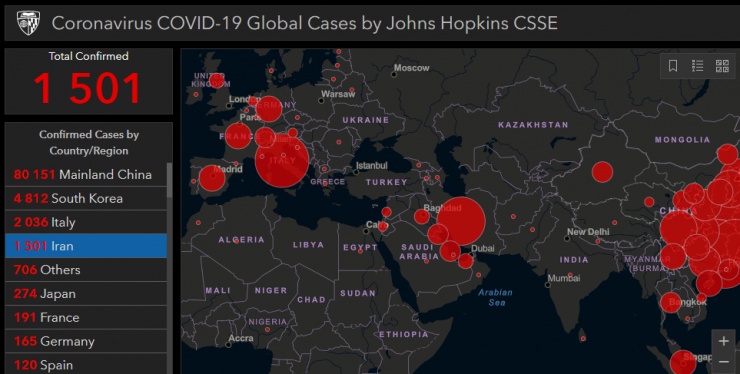 По данным Университета Джонса Хопкинса, коронавирусом в Иране заразился 1501 человек, число жертв составило 66 человек.