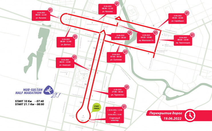 Оргкомитет Nur-Sultan Half Marathon информирует жителей и гостей столицы о том, что за день до забега и в день полумарафона будет частично перекрыто движение на некоторых участках дорог.