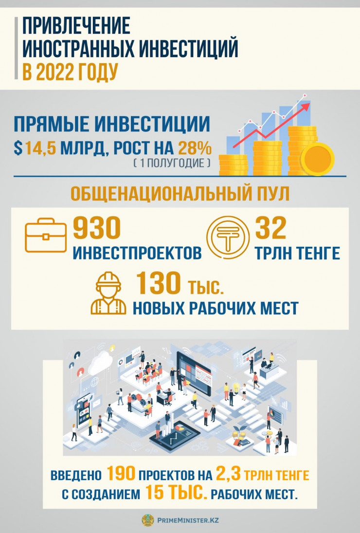 Что касается привлечения иностранных инвестиций, то по итогам I полугодия привлечено 14,5 миллиарда долларов прямых инвестиций (на 28 процентов больше, чем в прошлом году). Ведется работа с общенациональным пулом, который состоит из 930 проектов с привлечением инвестиций на общую сумму порядка 32 триллионов тенге (из более 30 стран мира) и предполагает создание порядка 130 тысяч рабочих мест. На сегодня введено 190 проектов на 2,3 триллиона тенге с созданием 15 тысяч рабочих мест, в том числе 45 проектов с участием иностранных компаний на сумму 1,7 триллиона тенге.