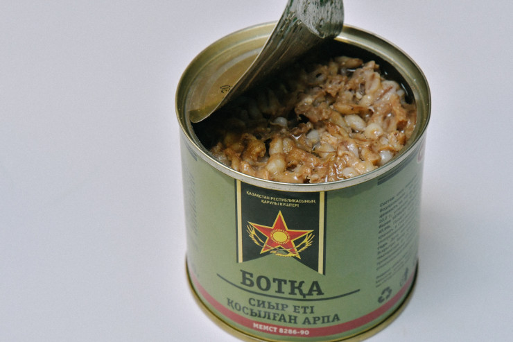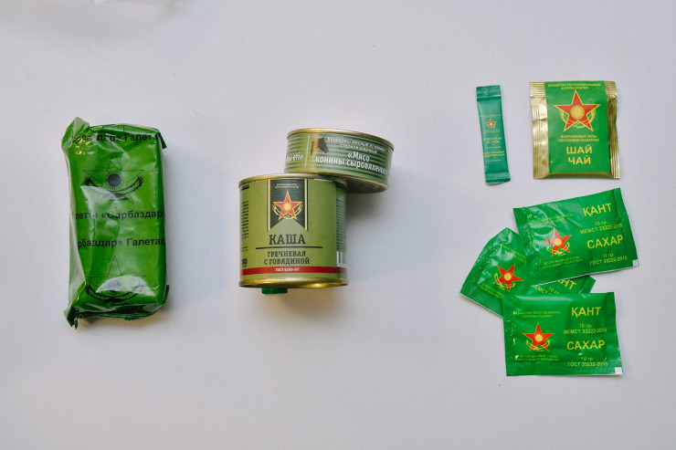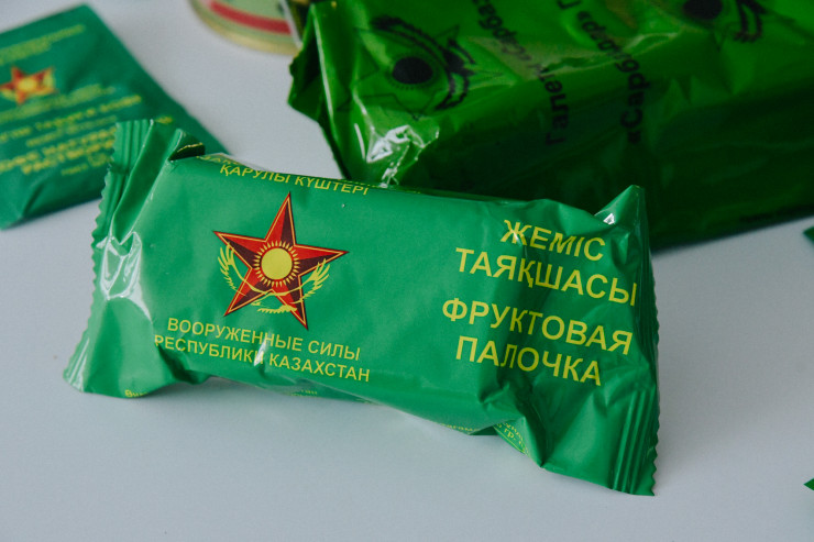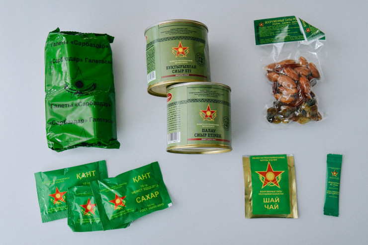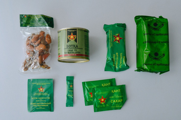 Во время полевых учений, когда нет возможности приготовить горячую еду, каждому казахстанскому солдату предоставляется индивидуальный рацион питания. Сухой паек рассчитан на одни сутки, в нем предусмотрены завтрак, обед и ужин. Министерство обороны Казахстана предоставило один из таких редакции Tengrinews.kz.