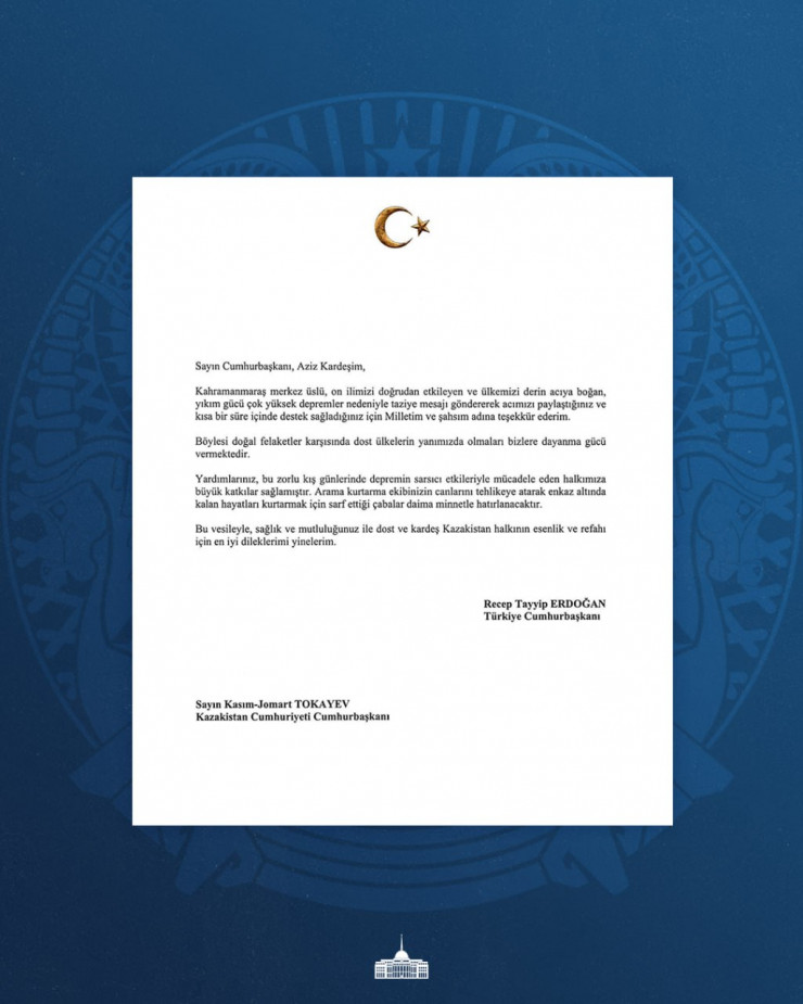 В своем письме Эрдоган от имени турецкого народа и от себя лично поблагодарил Главу государства Касым-Жомарта Токаева за соболезнования в связи с разрушительным землетрясением, которое нанесло огромный ущерб провинции Кахраманмараш и другим населенным пунктам Турции, а также выразил признательность за оказание экстренной помощи братской страны.