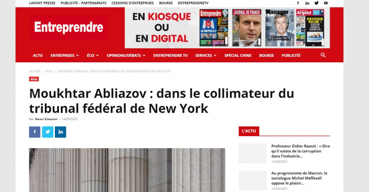 "Преследуемый за хищения в стране своего происхождения бизнесмен Мухтар Аблязов – один из богатейших людей Казахстана в 2000-х годах, который сейчас живет во Франции – обвиняется французским правосудием. Будучи подозреваемым в хищении средств при помощи запутанной сети подставных компаний, он также предстает перед судом в Соединенных Штатах. Действительно, теперь очередь Федерального суда Нью-Йорка изучить жалобы, поданные банком БТА, совет директоров которого он возглавлял с 2005 по 2009 год, против него и против его зятя и бывшего партнера Ильяса Храпунова, сына бывшего мэра Алматы Виктора Храпунова, который также преследуется в судебном порядке за хищение государственных средств и растрату корпоративных активов. Эта нью-йоркская процедура была инициирована более пяти лет назад", - отмечается в статье.