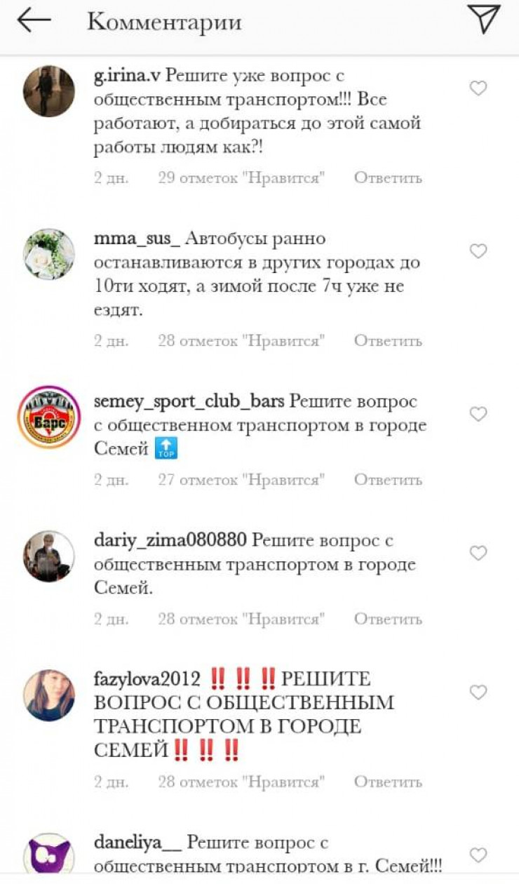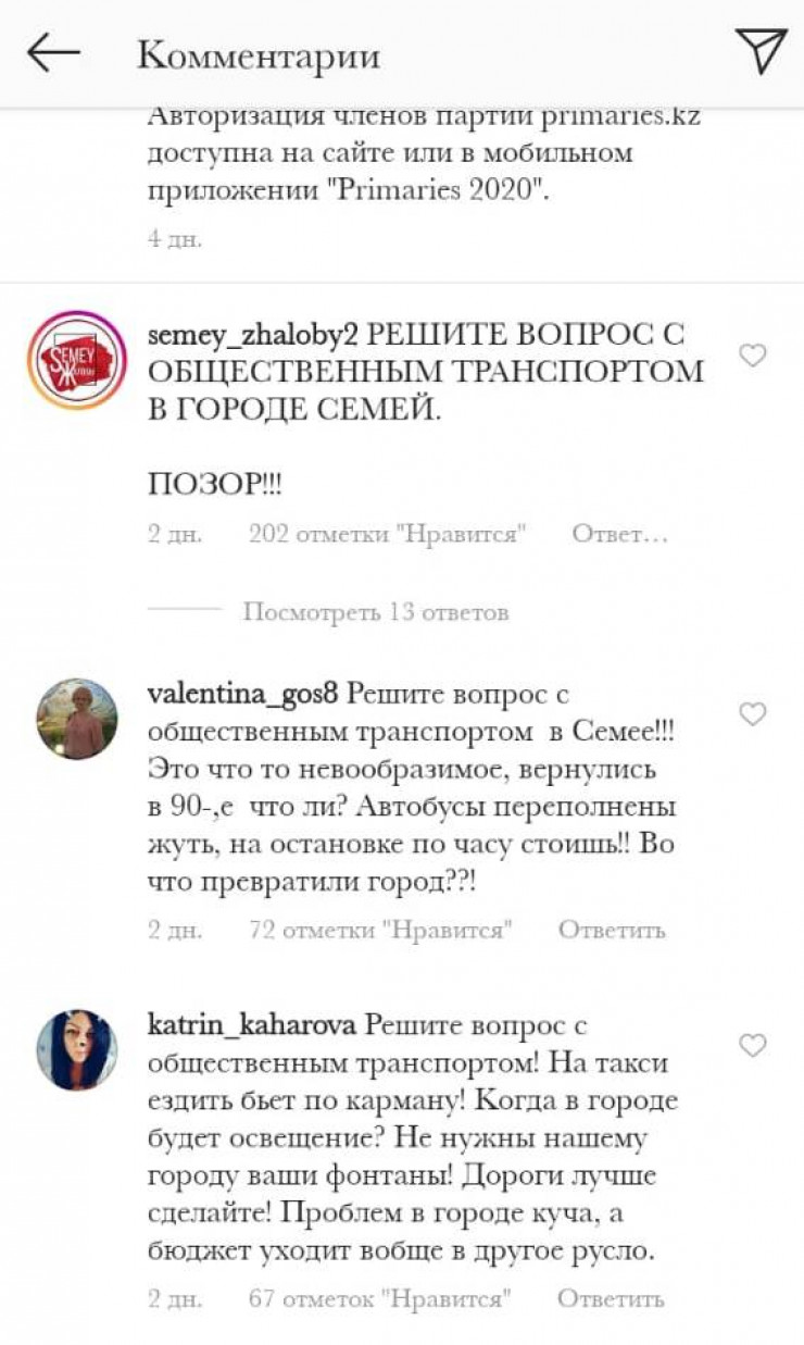 Пользователи Сети массово оставляют комментарии к публикациям акима Восточно-Казахстанской области в Instagram, передает корреспондент Tengrinews.kz. Жители Семея просят решить транспортный вопрос в городе.