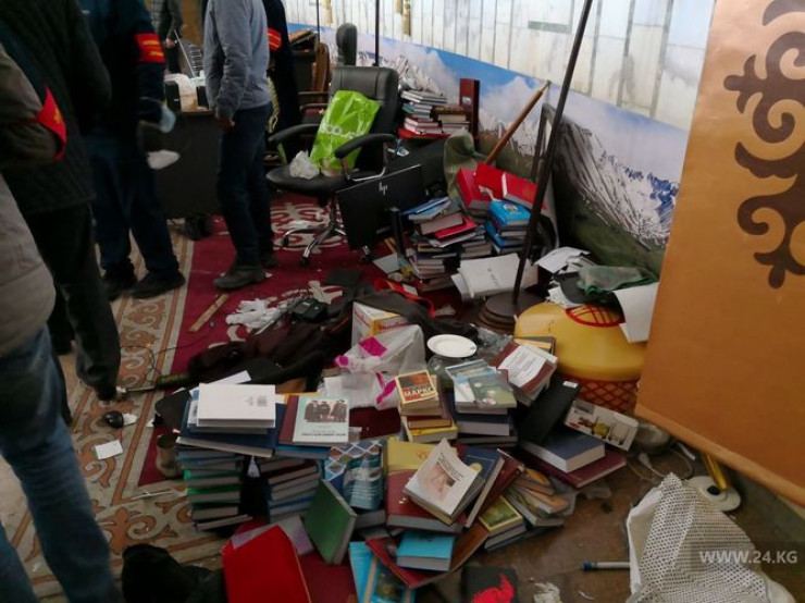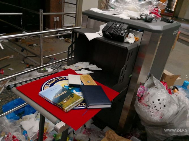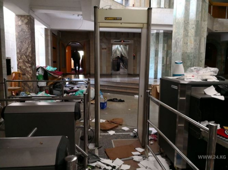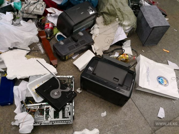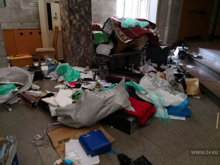 Во всех помещениях царит хаос. Добровольцы со всего Кыргызстана продолжают охранять здание от мародеров.