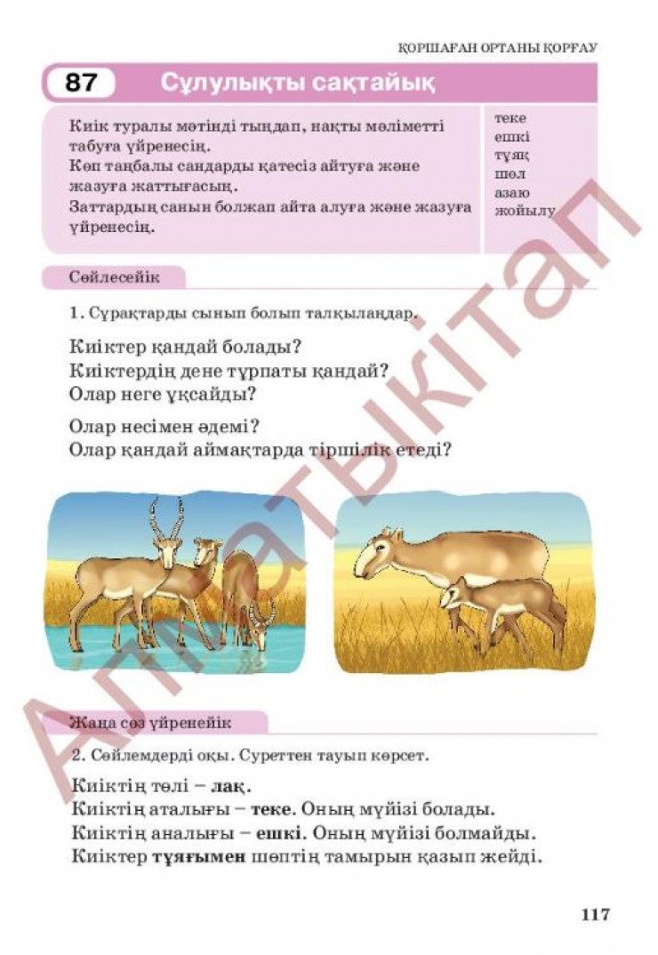 А эксперт по казахскому языку отметил некоторые ошибки в терминах. Ардак Нурмаганбет отмечает, что авторы учебника употребили слово "ешкі" для обозначения самки сайгака и "теке" - самца, что с казахского переводится как "коза" и "козел". По его словам, такие данные могут запутать учеников четвертого класса. Он также объяснил, что потомство сайгаков называют "лақ" в разговорном стиле, а на литературном языке нужно говорить "құралай".