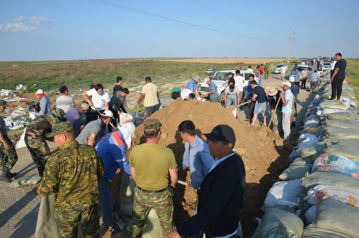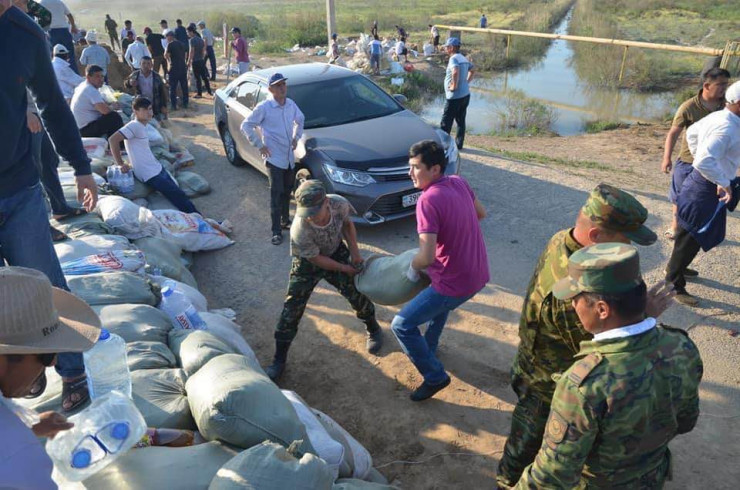 Военные и бойцы ЧС, местные жители и волонтеры спасают дома от все прибывающей воды. Таким образом, удалось отстоять 9 населенныx пунктов. А уже сегодня после обеда жители райцентра Мырзакент вернутся в свои дома.
