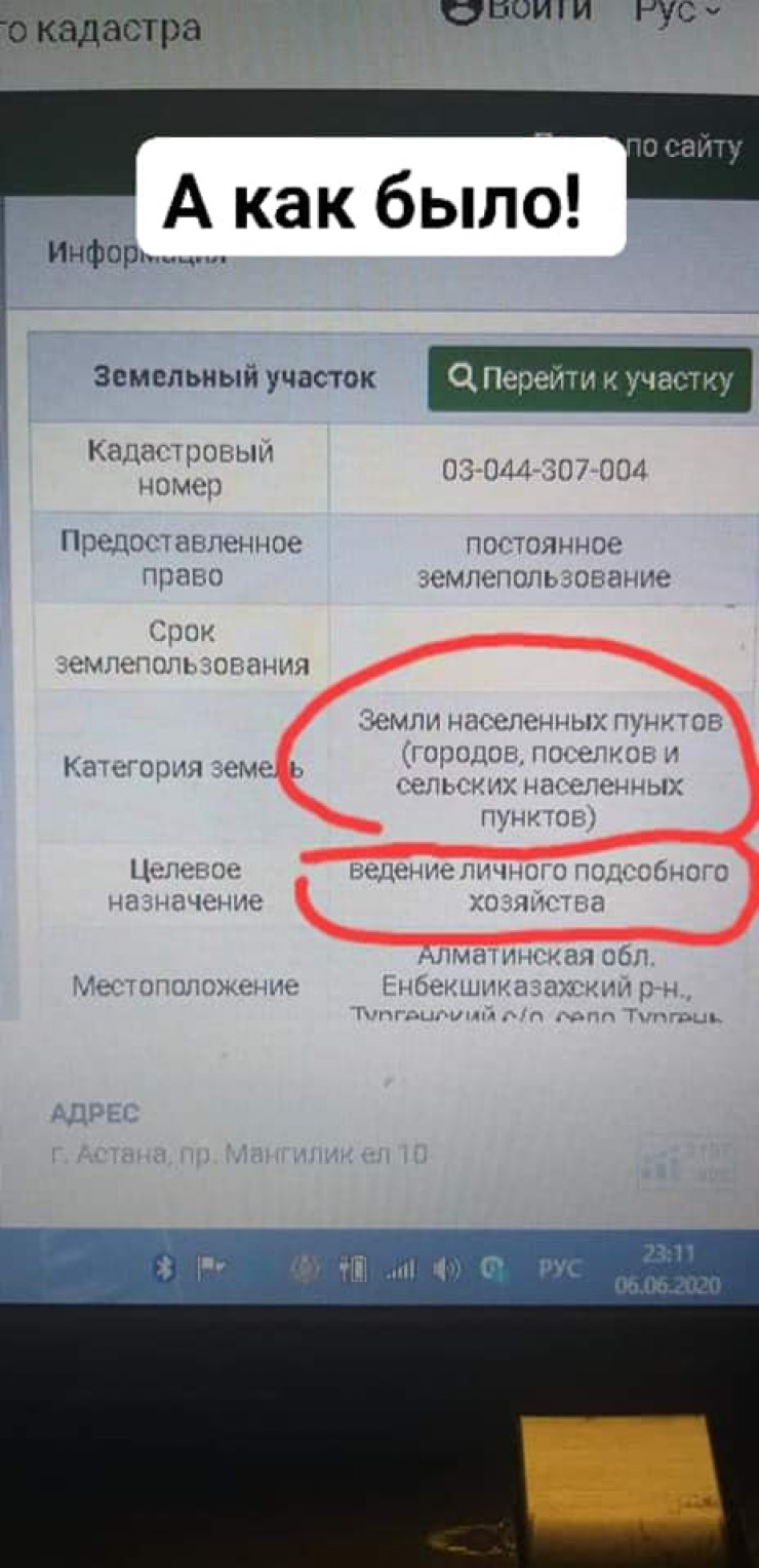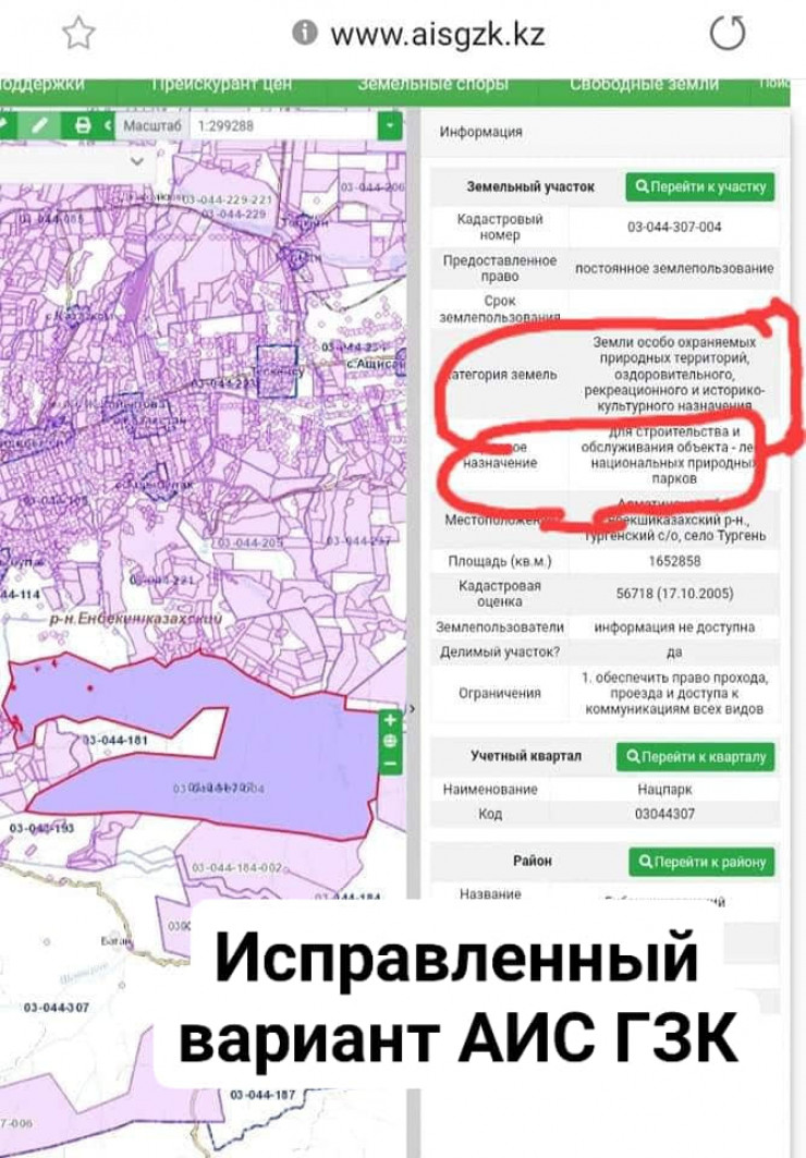 "После серии постов в базе АИС ГЗК исправляют ошибки: меняют целевое назначение земельного участка нацпарка, убирают ЛПХ и переводят землю в категорию ГНПП "Нацпарк "Иле-Алатауы". Первое, в базе АИС ГЗК на земельный участок с кадастровым номером 03-044-307-004 площадью в 165214,959 квадратного метра нацпарка, расположенный в селе Тургень Енбекшиказахского района (который находился на балансе МИО), целевое назначение "для ведения ЛПХ" исправляют на "для строительства и обслуживания объекта - леса национальных природных парков". И второе, исправляют категорию указанной земли с "земли населенных пунктов" на "земли особо охраняемых природных территорий". Успел сделать скриншоты", - написал Бакытжан Базарбек.