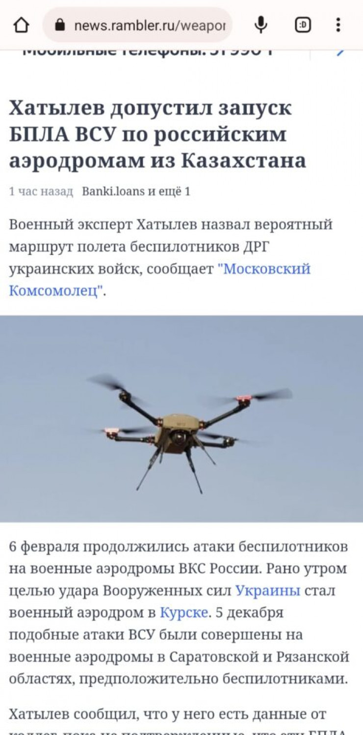 В российских СМИ появилась информация о том, что с территории Казахстана был запущен беспилотник, принадлежащий вооруженным силам Украины. Его целью якобы были российские аэродромы. В Министерстве обороны Казахстана опровергли данную информацию.