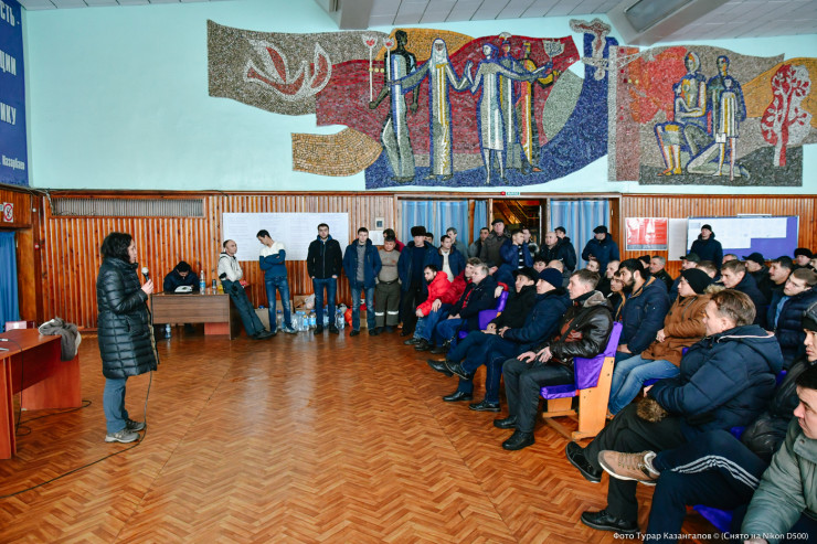 Впервые папа детально рассказал о своем участии в голодовке несколько лет назад. Это было после забастовки шахтеров в Караганде, в декабре 2017 года. Тогда я и мой коллега, фотограф Турар Казангапов, отправились в шахтерскую столицу, чтобы осветить это событие. Папа ни разу не спросил меня о той командировке, как не стал давать оценку нашему материалу. Но как-то он увидел вот это фото. Оно было сделано нашим фотографом на шахте "Казахстанская". Тогда мужчины завели нас в актовый зал и дали мне микрофон с призывом: "Говори!". В зале на тот момент присутствовало около 200 шахтеров.