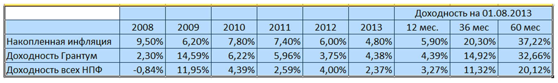 Доходность "Грантума" за последние шесть лет была выше 10 процентов только в 2009 году, когда был отскок по акциям после снижения в 2008 году - тогда, кстати, "Грантум" показал 2,3 процента доходности. Доходность пенсионной системы за 2014 год составила 6,31 процента (инфляция = 7,4 процента) против 2,37 процента (инфляция = 4,8 процента) в 2013 году. Здесь надо еще учесть, что 6,31 процента - это за вычетом признанных убытков, а без них можно было бы чуть больше 9 процентов. Если бы эти убытки признали в 2013 году, тогда было не 2,37 процента, а около нуля.