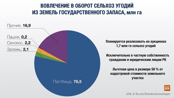 Акиматами областей запланирована реализация в 2016 году в частную собственность посредством торгов 1,7 миллиона гектаров сельскохозяйственных земель по всей республике. Всего сельхозугодий в нашей стране - почти 100 (!) миллионов гектаров. То есть, на торги казахстанцам будет выставлен 1,7 процента от всех угодий.