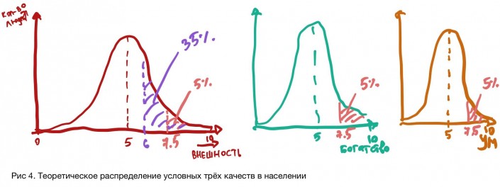 Представим, что существует только три фактора, по которым люди выбирают себе пару: внешность, богатство и некий фактор, который предсказывает будущую успешность: за отсутствием лучшего, давайте назовем этот фактор умом. Как и другие атрибуты, каждое из этих качеств скорее всего имеет нормальное распределение в населении (normal distribution). Посмотрим на рисунок 4.