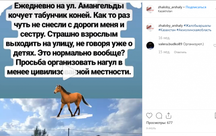 Конечно, в таких группах поднимаются социальные вопросы, проблемы инфраструктуры. Публикации получают широкий резонанс, тему подхватываем мы, журналисты, и вуаля, проблема наконец-то решается. Но здесь есть и обратная сторона медали. Мы привыкаем жаловаться в соцсетях. И причем не всегда на существенные проблемы. К примеру, пост в аккаунте "Жалобы Аршалы". Сельчанин жалуется на лошадей , которые кочуют на одной из улиц в ауле, и просит их отправить в менее цивилизованную часть деревни.