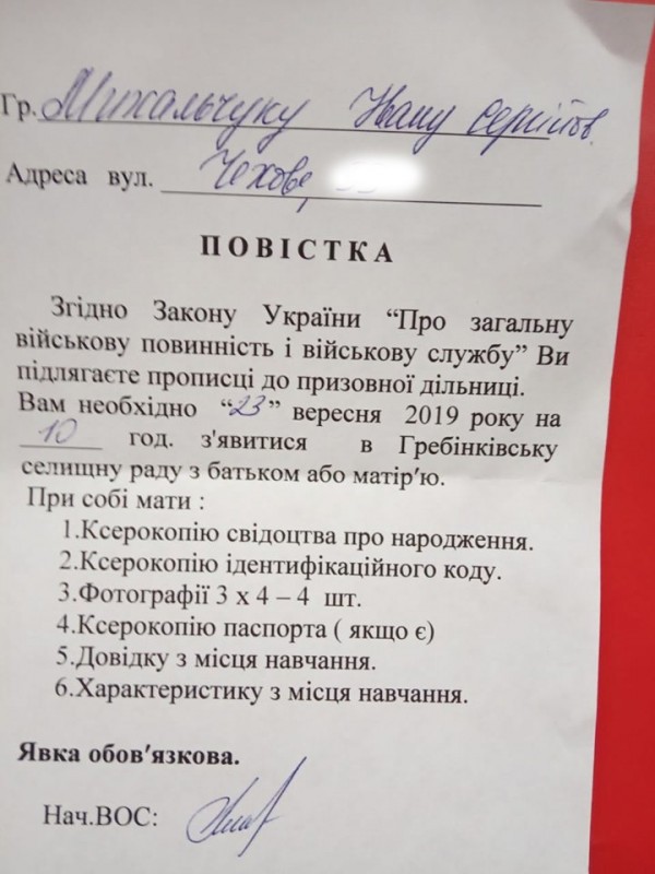 В повестке указано, что согласно Закону Украины "Об общей воинской повинности и военной службе" ребенок подлежит прописке в призывном пункте. До 23 сентября он должен явиться в сельсовет с одним из родителей. При этом указано, что явка обязательна. При себе необходимо иметь ряд документов.