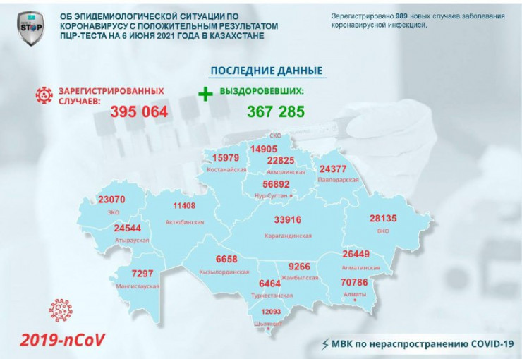 За прошедшие сутки в Казахстане выявили 989 новых случаев заражения COVID-19. Больше всего в Карагандинской области, Нур-Султане и Алматы, передает Tengrinews.kz со ссылкой на данные Межведомственной комиссии по нераспространению COVID-19.