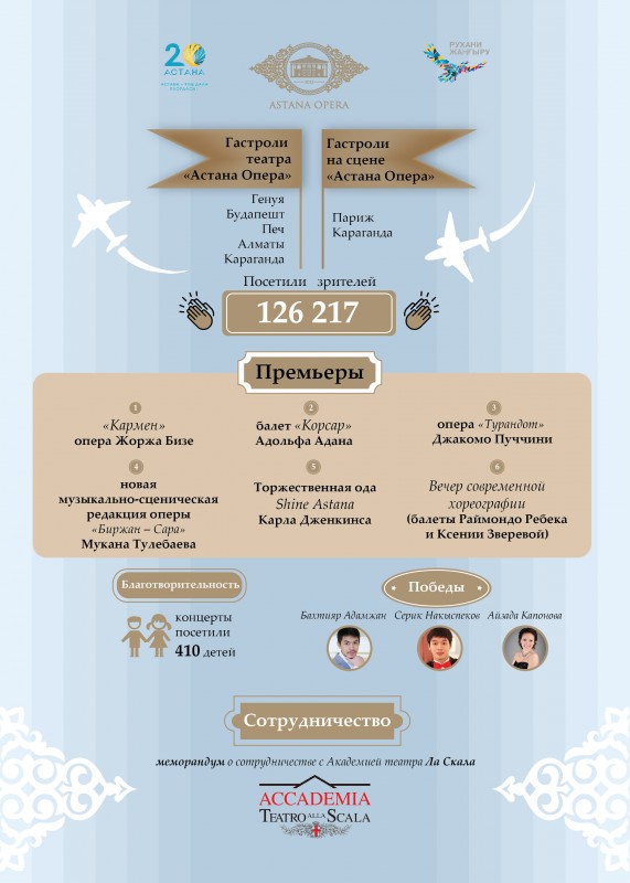 Масштабные проекты пятого, юбилейного сезона театра "Астана Опера" были посвящены 20-летию Астаны. Репертуар пополнили мировые шедевры оперного и балетного искусства. Все это - результат огромных усилий творческого коллектива крупнейшего театра страны под эгидой Министерства культуры и спорта, полномасштабно реализующего Концепцию культурной политики, утвержденную Президентом Казахстана Нурсултаном Назарбаевым.