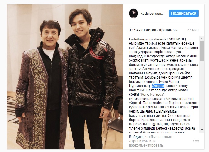По словам Кудайбергена, инициатором встречи стал Джеки Чан, который увидел выступление певца по телевизору. "На встрече актер подарил мне свою эксклюзивную куртку, а также фирменное устройство для прослушивания музыки. А я подарил ему казахский чапан и домбру", - рассказал певец. По его словам, он также сыграл для Джеки Чана на домбре композицию Нургисы Тлендиева "Әлқиса". В свою очередь, казахстанца Джеки Чан научил приемам из фильма Kung Fu Yoga.