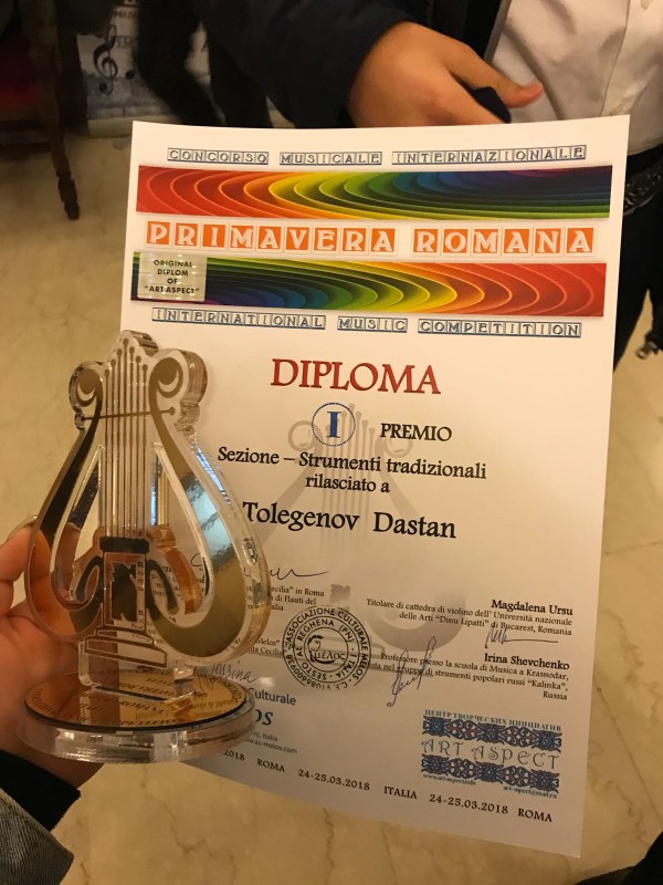 "24 марта в Риме проходил конкурс Primavera Romana, где мой родной братишка, выступая с домброй от Казахстана, занял первое место в номинации "Народные инструменты" в категории II (11-14 лет). Диплом лично в руки вручал ректор консерватории Ватиканского института духовной музыки. Я очень горд за своего братишку", - рассказал брат школьника Рустем Тулегенов.