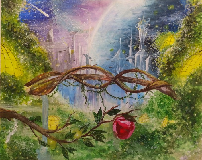 Ерлик Жарылгапов также уделил внимание людям будущего. Судя по его рисунку, в Казахстане будущего по-прежнему любят мотивы домбры и чаепитие.