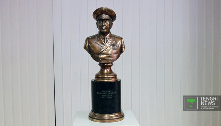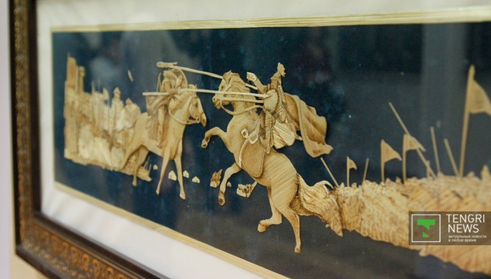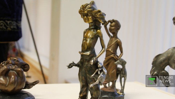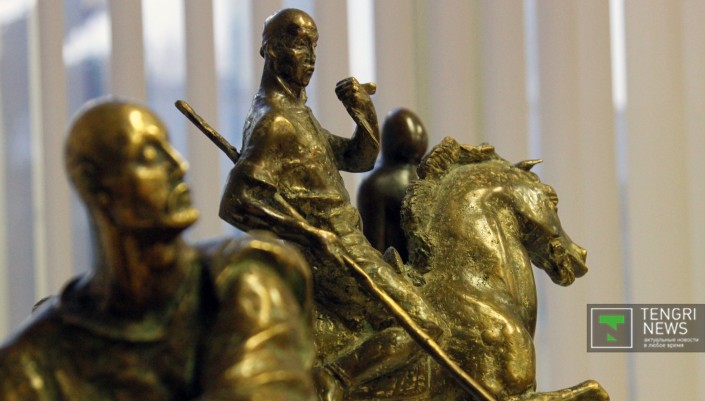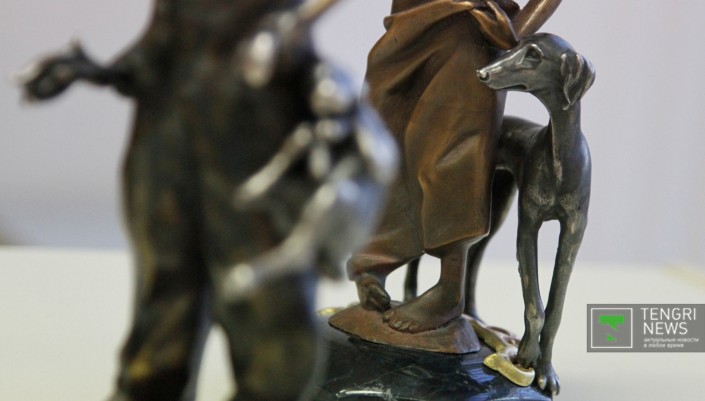 Станковая скульптура, представленная на выставке бронзой, деревом и камнем, также выдержана в тематике истории Казахского ханства.