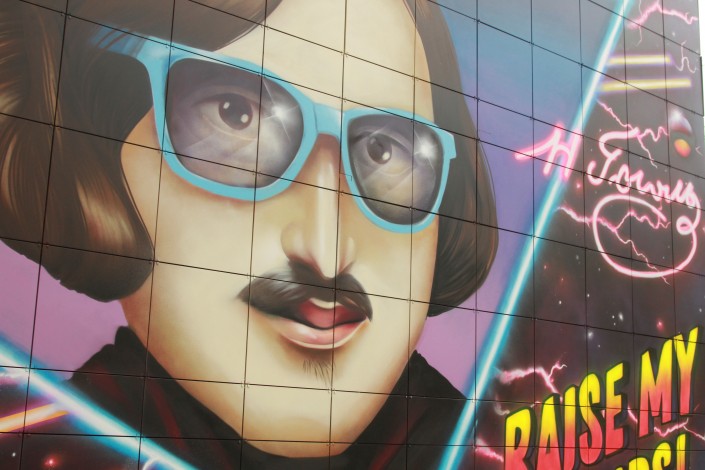 "При создании работы смиксован классический портрет Гоголя с тематикой ретровейв - стилистику 80-х отличают неоновые краски. Надпись "Raise my eyelids" - это цитата "Поднимите мои веки" из гоголевской мистической повести "Вий". На создание граффити ушло 300-400 баллончиков специализированной аэрозольной краски. Я совмещал российскую краску с европейской - в одной линейке не было всех нужных цветов. Сложностей не было, кроме погодных условий. Я зафиксировал лаком, чтобы держалось максимально долго. Так как граффити нанесено на плитку, а это очень капризный материал, вероятно, продержится от года до пяти лет", - уточняет автор идеи.