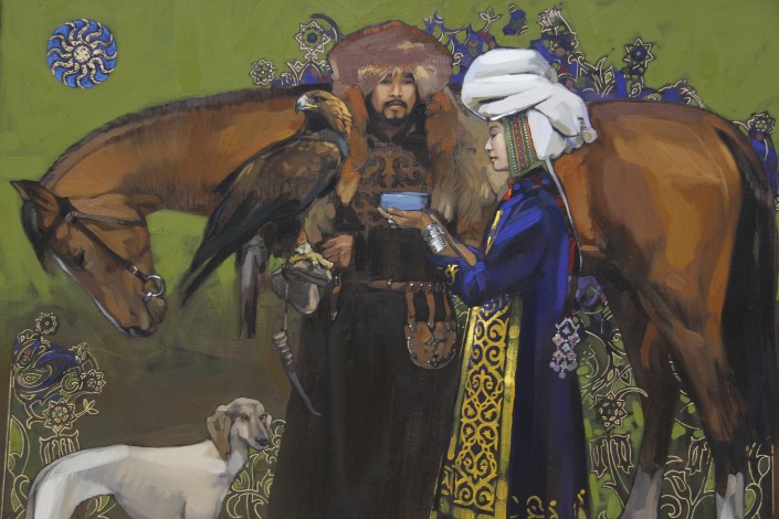 "В картине "Утро перед битвой" мне хотелось показать воина. Молодого, но в его глазах чувствуется, что он познал и горечь потерь, и вкус победы. Он понимает, что за ним родная земля, его близкие. (...) Я хотел передать атмосферу того времени - холодного дождя, гор, жайляу, воинов, которые уходят на бой с надеждой вернуться. Бирюзовый цвет олицетворяет очищение перед боем", - рассказал художник.