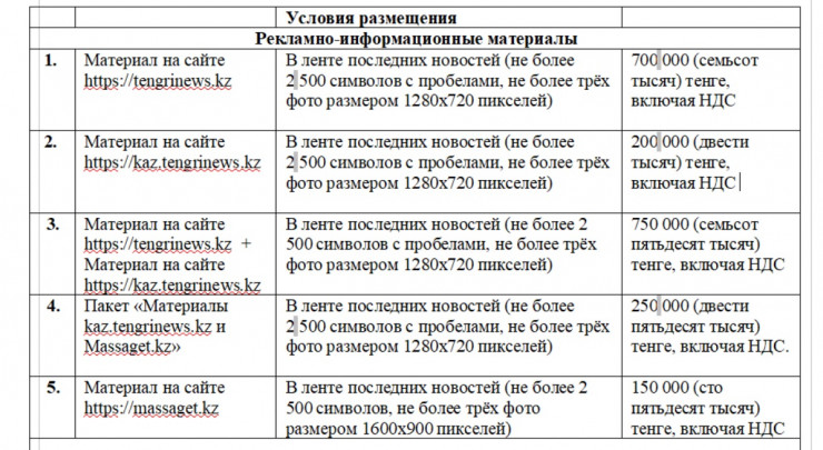 Стоимость размещения агитационных материалов на Сайтах «https://tengrinews.kz/» и «https://massaget.kz/» составляет: