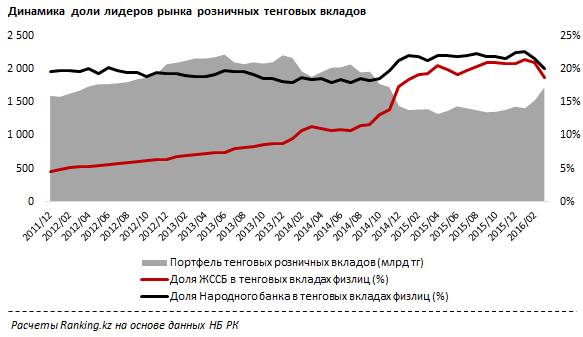 "Всего за январь-март 2016 года в тенговые депозиты физлиц был привлечен 51 процент всей суммы привлечения за 2015 год. На этом фоне совокупный размер портфеля розничных вкладов, номинированных в тенге, за год увеличился на 23 процента, до 1,7 триллиона тенге. Концентрация рынка розничных тенговых вкладов последние два года увеличилась, порядка 40 процентов рынка формируется двумя крупнейшими банками в сегменте - Жилстройсбербанк и Народный банк", - пояснили аналитики.