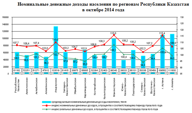 В числе самых низкодоходных регионов в октябре оказались Южно-Казахстанская, Жамбылская и Алматинская области. Там величина доходов населения на 22-38 процента ниже республиканского уровня. Вместе с тем сообщается, что быстрее всего реальные денежные доходы растут в Мангистауской области и в Астане. В комитете отметили, что соотношение между максимальными и минимальными величинами номинальных доходов по регионам в октябре 2014 года составило 3,5 раза. Такой показатель наблюдался и в октябре 2013 года.