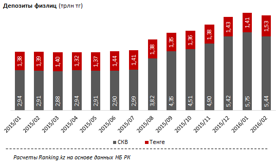 За февраль 2016 года рынок тенговых вкладов населения вырос на 8 процентов, до 1,53 триллиона тенге, а в долларах сократился на 5 процентов, до 5,44 триллиона тенге. К такому выводу пришла аналитическая служба Ranking.kz