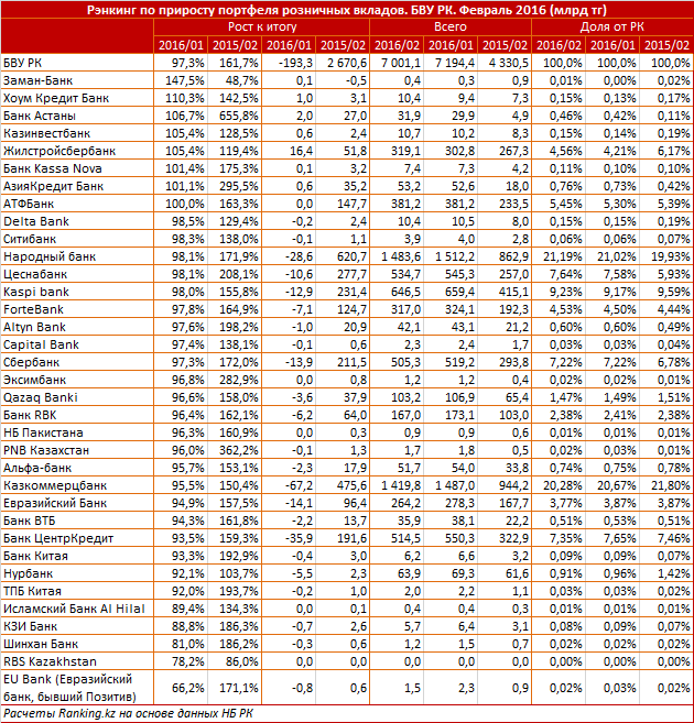 Кроме того, по их мнению, увеличить розничный портфель в феврале удалось всего восьми банкам из 35. "Лидер по приросту - Заман Банк, который с низкого старта за месяц нарастил объем депозитов почти в полтора раза. Однако на конец февраля его портфель составлял всего 440 миллионов тенге, на 57,5 процента меньше, чем годом ранее. А ставки по годовым депозитам - от 6,20 процента до 7,50 процента (самый низкий уровень на рынке). Очевидно, что политика банка не нацелена на массовое привлечение вкладчиков", - пояснили специалисты.