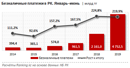 За аналогичный период прошлого года сумма безналичных платежей составляла 2,2 триллиона тенге.