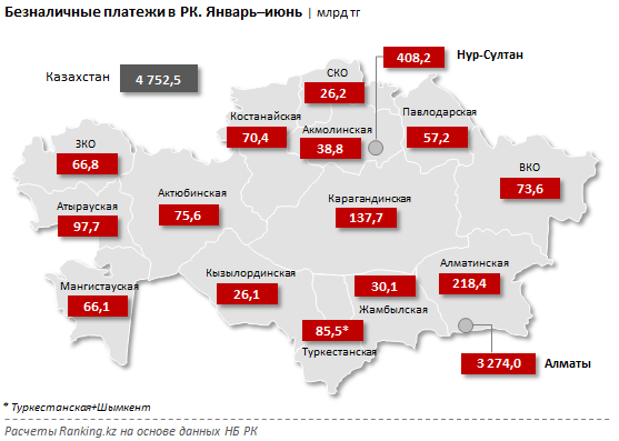 На втором месте Нур-Султан: сумма безналичных платежей в регионе составила 408,2 миллиарда тенге, доля равна 8,6 процента (годом ранее - 198,3 миллиарда тенге, или 9,2 процента). Замыкает тройку регионов с наибольшим объемом безналичных платежей Алматинская область: 218,4 миллиарда тенге с долей в 4,6 процента (годом ранее - 52,1 миллиарда тенге, или 2,4 процента).