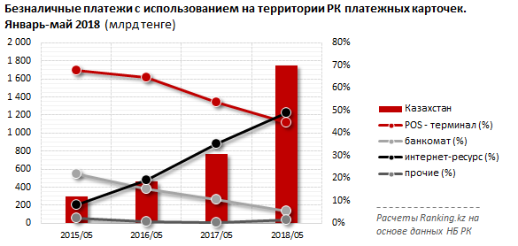 Объем безналичных платежей за январь-май 2018 года составил более 1,7 триллиона тенге. Это в 2,3 раза больше, чем за аналогичный период прошлого года.