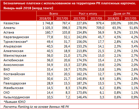 Рост объема безналичных платежей отмечен во всех регионах. По объему безнала с использованием платежных карт в Казахстане за январь-май уверенно лидирует Алматы - 1,1 триллиона тенге, это в 2,8 раза больше, чем в 2017 году. Доля мегаполиса увеличилась сразу с 51,6 до 63,3 процента.