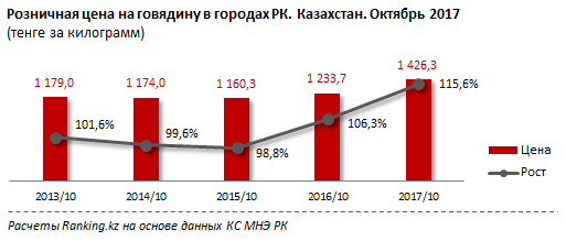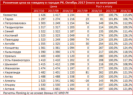 Розничная цена за килограмм мяса коровы на конец октября 2017 года составила 1 426,3 тенге. С начала года произошло подорожание на 15,6 процента (192,7 тенге), за месяц - на 0,7 процента (9,4 тенге).
