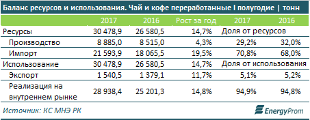 По итогам первого полугодия 70,8 процента спроса на чай и кофе обеспечил импорт: 21,59 тысячи тонн, +19,5 процента год-к-году. Реализация чайно-кофейной продукции на внутреннем рынке страны выросла на 14,8 процента, до 28,94 тысячи тонн.