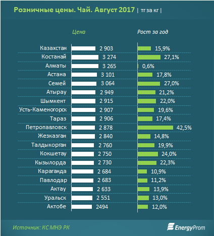 За август цены на чай поднялись к июлю еще на 0,1 процента и составляли к концу месяца 2,9 тысячи тенге за килограмм.