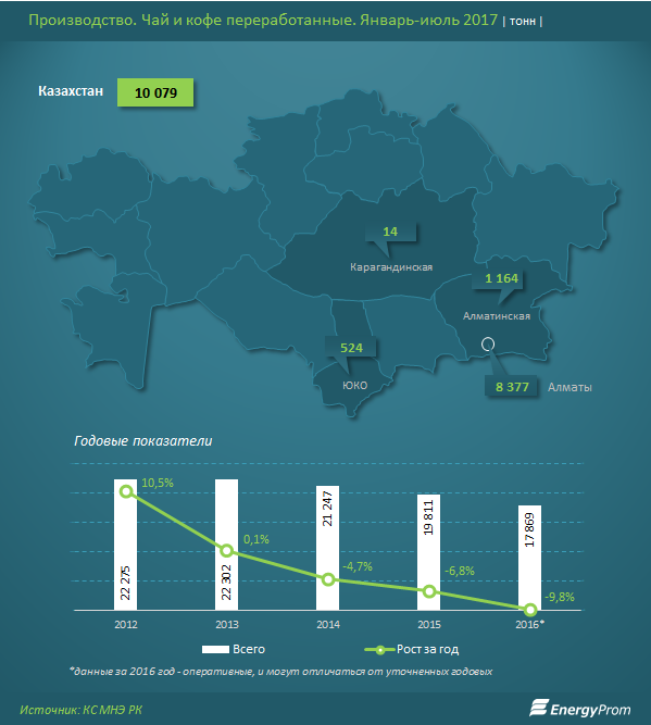 Производство чайно-кофейной продукции за январь-июль 2017 года составило 10,08 тысячи тонн - всего на 1,8 процента больше, чем годом ранее. Стагнация обусловлена сокращением объемов выпуска в главном регионе-производителе - Алматы (83,1 процента от РК против 86,7 процента годом ранее - это 8,38 тысячи тонн, минус 2,4 процента год-к-году).
