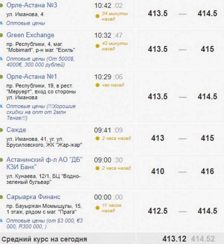 Накануне вечером американская валюта стоила на KASE на 0,52 тенге дешевле - 412,14.