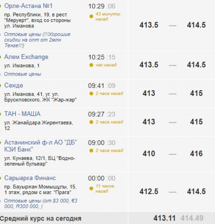 Отметим, что накануне утром в Алматы доллар продавали в среднем по 414,73 тенге.