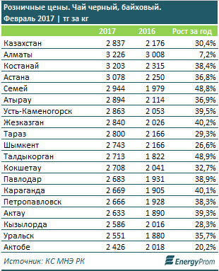 По итогам февраля черный байховый чай обходился казахстанцам в 2 837 тенге за килограмм - на 30,4 процента дороже, чем годом ранее. Дороже всего среди крупных городов и мегаполисов страны любимый напиток обходился жителям Алматы, Костаная и Астаны. Сильнее всего чай подорожал в Талдыкоргане - сразу на 48,9 процента за год.