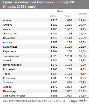 Самая высокая цена за килограмм баранины также в Астане - 1 720 тенге, рост за год на 15,4 процента.