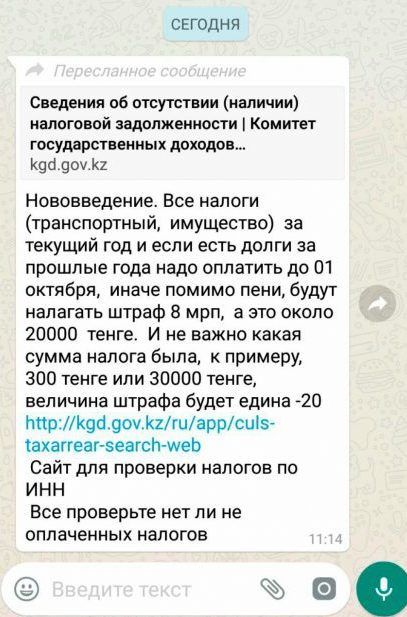 В Комитете государственных доходов Министерства финансов Казахстана назвали фейком распространяющуюся в мессенджерах информацию о якобы высоких штрафных санкциях за несвоевременную уплату налогов физическими лицами. Об этом ведомство сообщает на своей странице в Facebook.