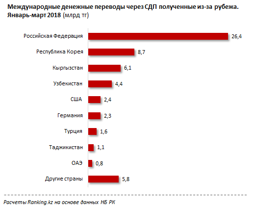 Среди стран, в которые были отправлены деньги, лидирует Россия: почти 50 миллиардов тенге, что на 30,1 процента больше, чем за январь-март 2017 года. При этом доля РФ уменьшилась с 46,2 процента до 44,1 процента.