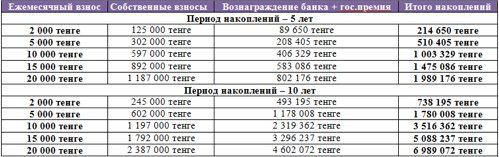 К примеру, первоначальный взнос 7 000 тенге, вознаграждение от банка 13,5 процента, государственная премия 5 процентов: