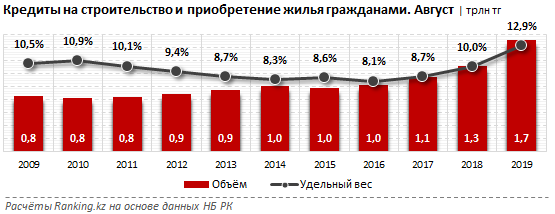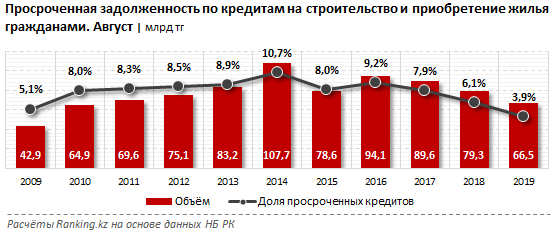 По данным аналитиков, в целом количество кредитов растет четвертый год подряд, однако просроченная задолженность по ипотечным займам при этом сокращается третий год подряд. На конец августа 2019 года она составляет 66,5 миллиарда тенге.