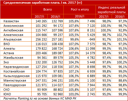 В региональном разрезе самые высокие заработные платы, традиционно, наблюдались в нефтяных регионах и столице (Атырауская область - 256,2 тысячи тенге, -0,4 процента за год, Мангистауская - 247,3 тысячи, +0,4 процента за год, Астана - 203,5 тысячи тенге, +7,6 процента за год). Самый высокий годовой рост номинальных заработных плат отмечен в Астане, Акмолинской и Актюбинской областях (на +7,6 процента). При этом индекс реальной заработной платы положителен лишь в последних двух регионах - 100,3 процента.